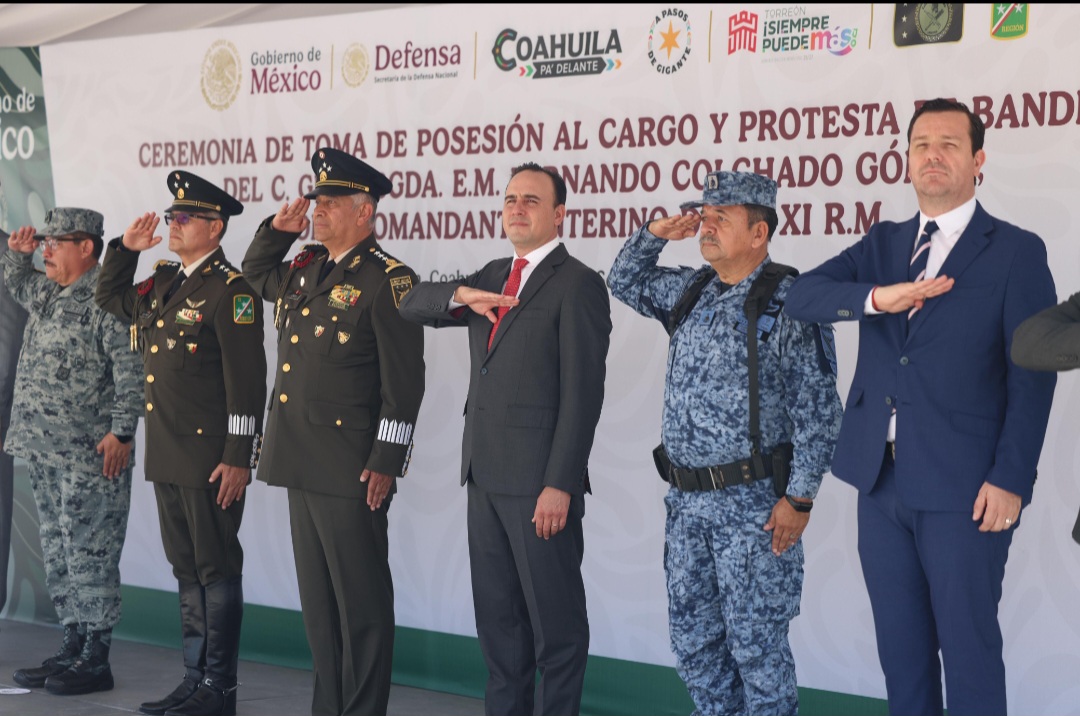 Torreón, Coahuila de Zaragoza; a 04 de septiembre de 2025.- El gobernador Manolo Jiménez Salinas asistió a la ceremonia en la que el General de Brigada E.M. Fernando Colchado Gómez, tomó posesión del cargo de Comandante interino de la XI Región Militar, la cual abarca los estados de Coahuila y Chihuahua. “Hoy acompañamos en su toma de protesta y le dimos la bienvenida a nuestro Estado, al C. General de Brigada E.M. Fernando Colchado Gómez, nuevo Comandante de la XI Región Militar. Aquí en Coahuila trabajamos con voluntad y coordinación con el Ejército Mexicano y las Fuerzas Armadas, siempre sumando esfuerzos para mantener la seguridad, la paz y el desarrollo de nuestro estado”, manifestó el Gobernador de Coahuila. El General de División E.M. Francisco Jesús Leana Ojeda, Comandante del Ejército Mexicano, fue quien le dio posesión al nuevo Comandante de la XI Región Militar, quien sustituye en el cargo al General Alberto Ibarra Flores.