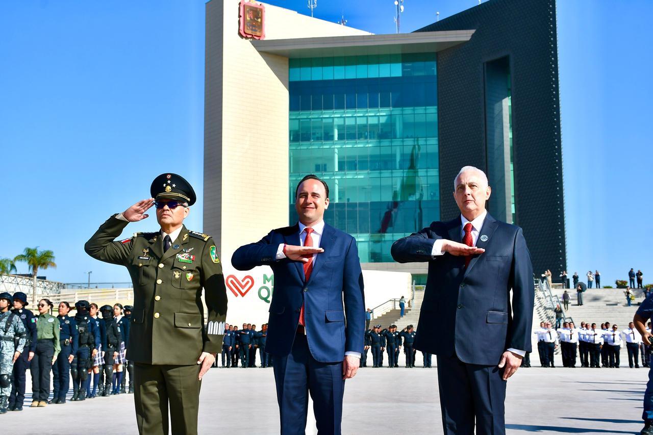 Torreón, Coahuila. A 24 de febrero de 2026 Este martes en la Plaza Mayor de Torreón, el gobernador Manolo Jiménez Salinas, presidió junto al alcalde Román Alberto Cepeda González, y el General deDivisión D.E.M. Fernando Colchado Gómez, comandante de la XI Región Militar, la ceremonia conmemorativa del Día de la Bandera. El acto cívico militar inició con los Honores e izamiento de bandera, con la participación de la Banda de Guerra, Banda de Música y coro de la XI región militar. En su intervención, el Presidente Municipal resaltó los símbolos de identidad, unión y soberanía que enmarcan al lábaro patrio. “Estos símbolos quedan claros en Coahuila y en Torreón, y siguen siendo estándares fundamentales para mantener la paz y la seguridad, así como una sociedad más justa y más equitativa”. Román Alberto Cepeda González dijo que este evento que se conmemora en el marco del mes del Ejército y la Fuerza Aérea Mexicana, es muestra de la unidad, el trabajo coordinado, la responsabilidad y el compromiso de seguir trabajando por México. “Es algo que tenemos muy en el corazón y nos corre en la sangre día a día, trabajar por nuestro querido Torreón, por La Laguna, por Coahuila y por nuestro querido México”. Asimismo, el gobernador Manolo Jiménez Salinas, dijo que se celebra un símbolo patrio que tiene una gran representación para las y los mexicanos: unidad, historia, identidad, y compromiso, valores que dijo, identifican al Estado. “Son palabras y valores con los que nos identificamos y que honramos todos los días trabajando en equipo por el bien de los 38 municipios del estado. Aquí en Coahuila tenemos una fórmula mágica que nos permite tener calidad de vida, y esa fórmula es trabajo en equipo, unidad, trabajo en conjunto con las y los ciudadanos, con los organismos de la sociedad civil, con la Iniciativa Privada, y siempre coordinados los municipios, el Estado, y la Federación, para trabajar por el bien de nuestra gente”, reiteró. El Gobernador dijo que gracias al trabajo conjunto, hoy se puede decir con orgullo que Coahuila es sin duda uno de los mejores lugares de México para vivir en familia, y manifestó su reconocimiento al Ejército Mexicano, a la Guardia Nacional y a las Fuerzas Armadas, por su apoyo por mantener al Estado seguro y en paz. Así como también a las corporaciones estatales y municipales, y se comprometió a seguir trabajando en coordinación, para mantener a Coahuila entre los tres estados más seguros del país, y a Torreón entre las ciudades más seguras. Por su parte, el General de División D.E.M. Fernando Colchado Gómez, comandante de la XI Región Militar, dio el mensaje alusivo a la conmemoración del Día de la Bandera, estandarte de identidad, cohesión y esperanza. “Hoy en esta histórica plaza de Torreón, Coahuila, corazón del norte de nuestro país, rendimos honores al símbolo supremo de nuestra nación: la Bandera de México, estandarte de identidad, cohesión y esperanza. Esta insignia ha sido fiel testimonio de lucha, transformación y consolidación de la nación” Agregó que la bandera de México es herencia, compromiso, memoria y esperanza. “Desde esta tierra de legalidad, justicia y estado de derecho, las tropas del Estado Mexicano renovamos el juramento de proteger la soberanía e independencia del territorio nacional”. Además, la Diputada Federal, Verónica Martínez García, externó en su mensaje que la Bandera nacional es un símbolo que une como patria, y que resume la historia, identidad, y el profundo amor por México, y reconoció a quienes reflejan este espíritu patriótico por Coahuila. “Nuestro reconocimiento a las Fuerzas Armadas, a la Guardia Nacional, al Mando Único, a la Policía Estatal y Municipal, a las Fiscalías, a nuestro Alcalde, a la sociedad civil, y a todos quienes desde sus trincheras aportan su valentía por mantener a Coahuila Seguro. Gracias al Gobernador por encabezar este modelo de seguridad que nos permite vivir en paz”. Durante la ceremonia, se realizó el abanderamiento de escoltas de diversas escuelas, y la Toma de protesta de bandera, a través del enlace para la transmisión del mensaje de la Presidenta de México, Claudia Sheinbaum Pardo. Estuvieron también presentes: Magistrado Miguel Mery Ayup, presidente del Tribunal Superior de Justicia del Estado; Federico Fernández Montañez, Fiscal General del Estado de Coahuila; Gral. Brigada E.M. Juan Carlos Quiroz Muñoz, comandante de la Sexta Zona Militar; Gral. Brig. Guardia Nacional D.E.M. Francisco Acuña Díaz, comandante de la coordinación estatal Coahuila; Gral. Brigadier E.M. Omar León Arroyo, comandante del Mando Especial Laguna; Gerardo Aguado Gómez, Diputado Local; Emmanuel Garza Fishburn, secretario de Educación; Hugo Gutiérrez Rodríguez, secretario de Seguridad Pública del Estado; y Gabriel Elizondo Pérez, coordinador general del programa Mejora.